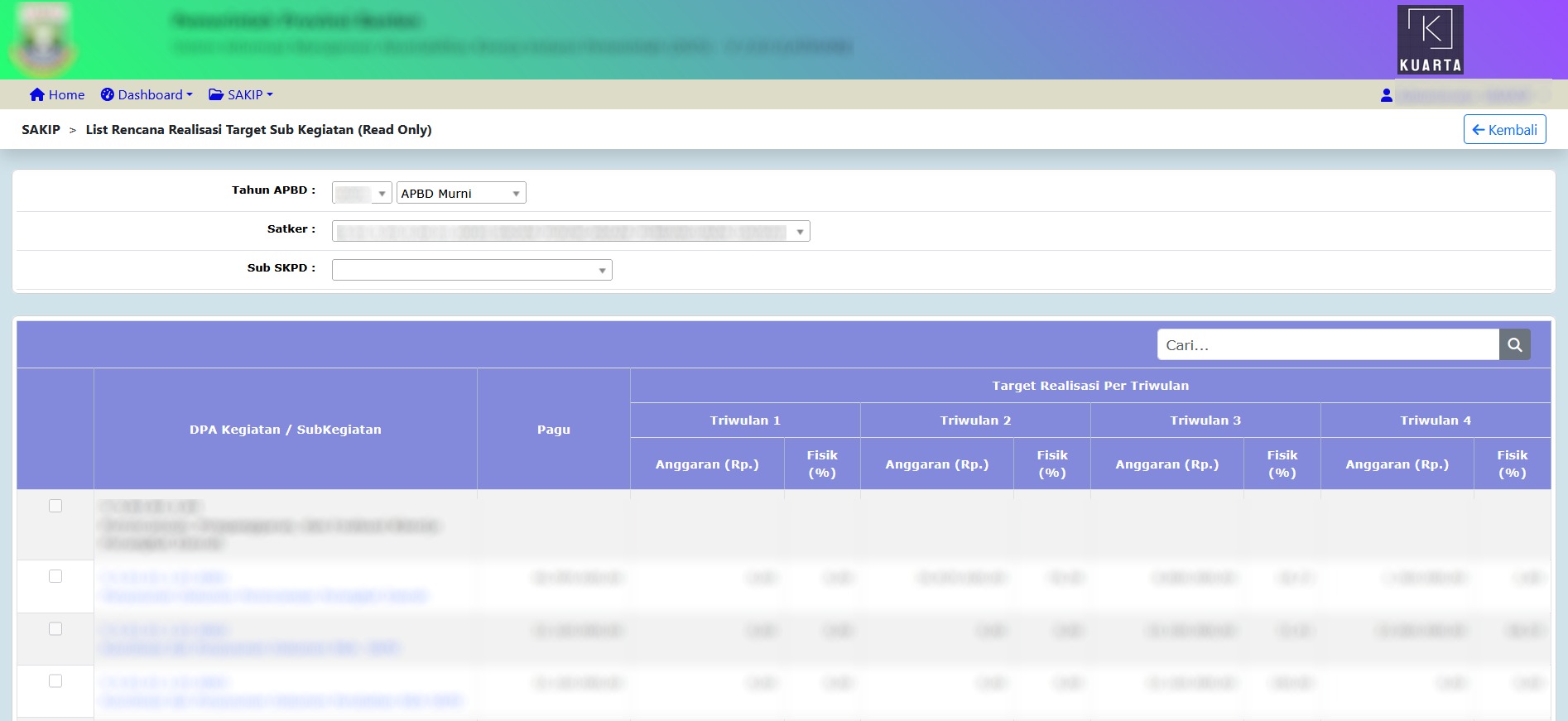 Pilih SAKIP > SAKIP SKPD > Target Realiasasi > Sub Kegiatan, akan tampil sebagai berikut :