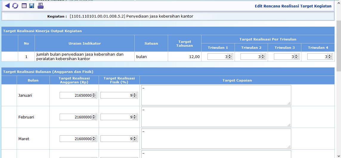 Isian untuk target realisasi anggaran (Rp.) per bulan, telah terisi otomatis dari hasil import data yang telah dilakukakn sebelum nya. Data diperoleh dari nilai anggaran kas yang kegiatan telah disusun pada saat penyusunan DPA Kegiatan.