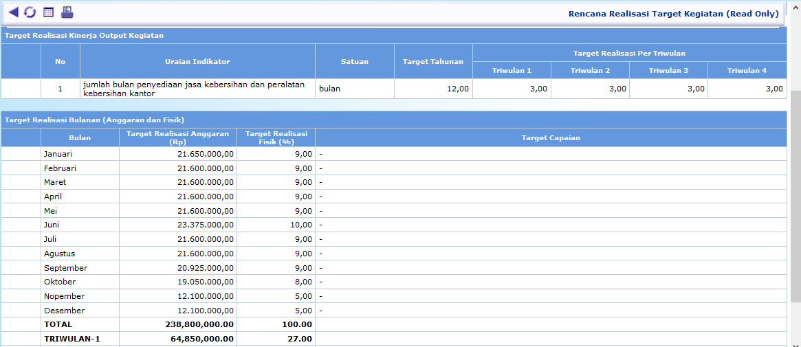 Untuk pengisian data atau melihat lebih detail terkait target capaian masing-masing kegiatan, pilih uraian nama kegiatan (klik) yang dikehendaki, maka akan ditampilkan target realisasi per triwulan untuk masing-masing indikator output kegiatan, dan target realisasi bulanan untuk realisasi anggaran dan fisik kegiatan, sebagaiaman tampilan berikut