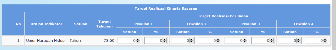 Isikan nilai target realisasi capaian per triwulan, baik nilai target persatuan dan target secara prosentase. Nilai yang diisikan per triwulan tidak kumulatif