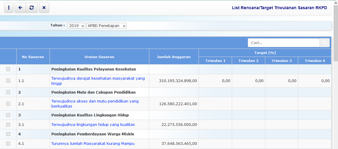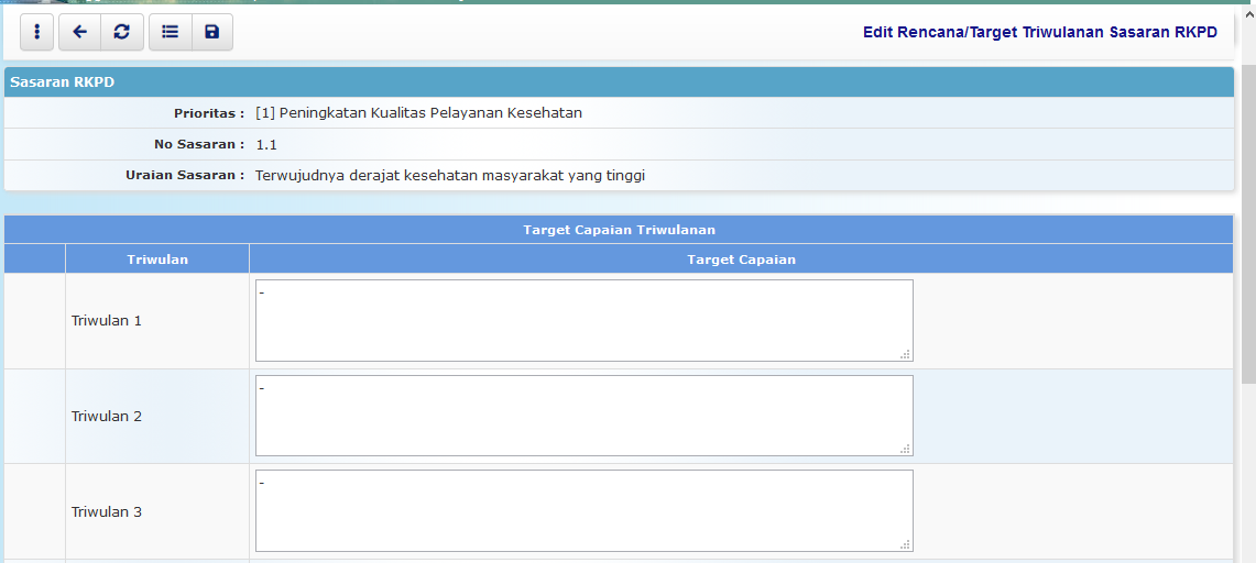 Untuk pengisian data atau melihat lebih detail terkait target capaian masing-masing indikator sasaran, pilih uraian sasaran (klik) yang dikehendaki, maka akan ditampilkan